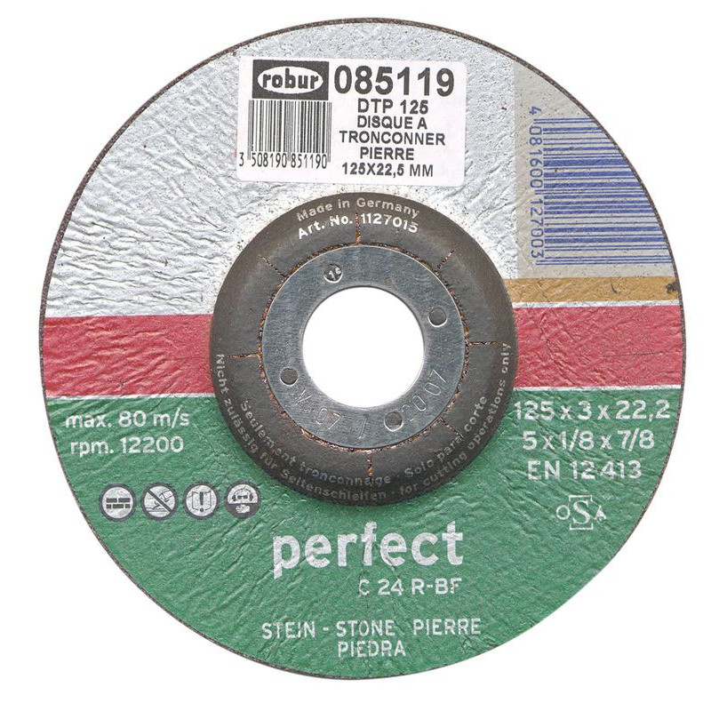Disque à tronçonner la pierre. 125x3mm, alésage 22.2mm. Plat. Vitesse 12200 t/mn (085119)