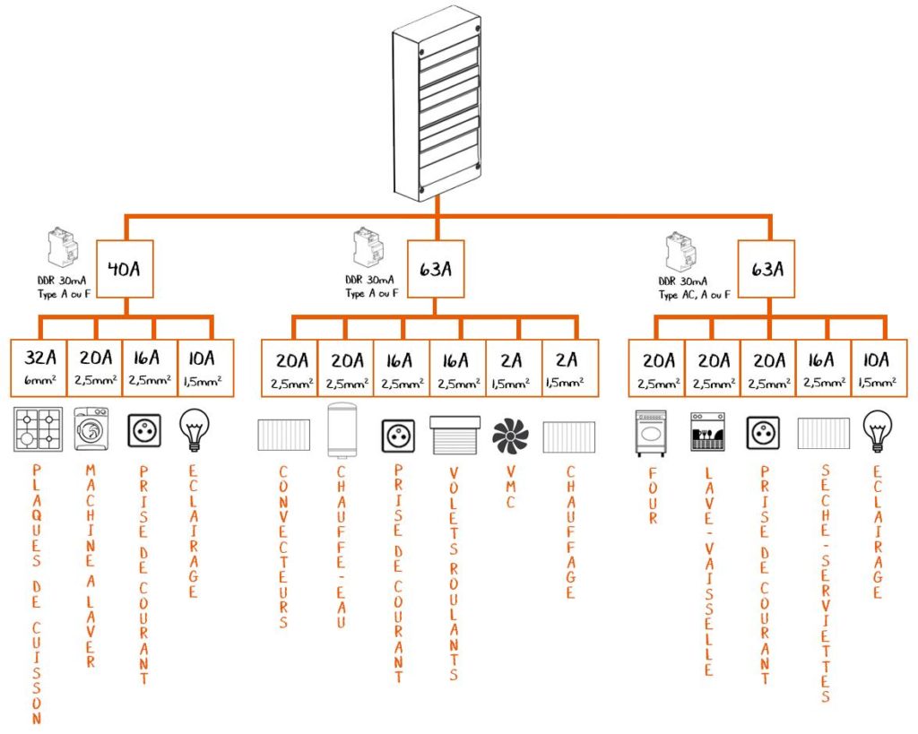 • Différentiel 1 → circuits du rez-de-chaussée (prises salon, éclairage salon, prises cuisine, éclairage cuisine…)