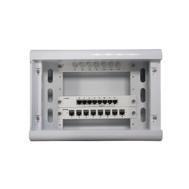 Équipement standard du coffret multimédia compact : cette configuration est optimisée en GRADE 3 à 900 Mhz. Elle pourrait tout aussi bien être configurée en Grade 3+. Il serait alors nécessaire d'ajouter un module de brassage supplémentaire permettant de brasser les prises coaxiales satellites.