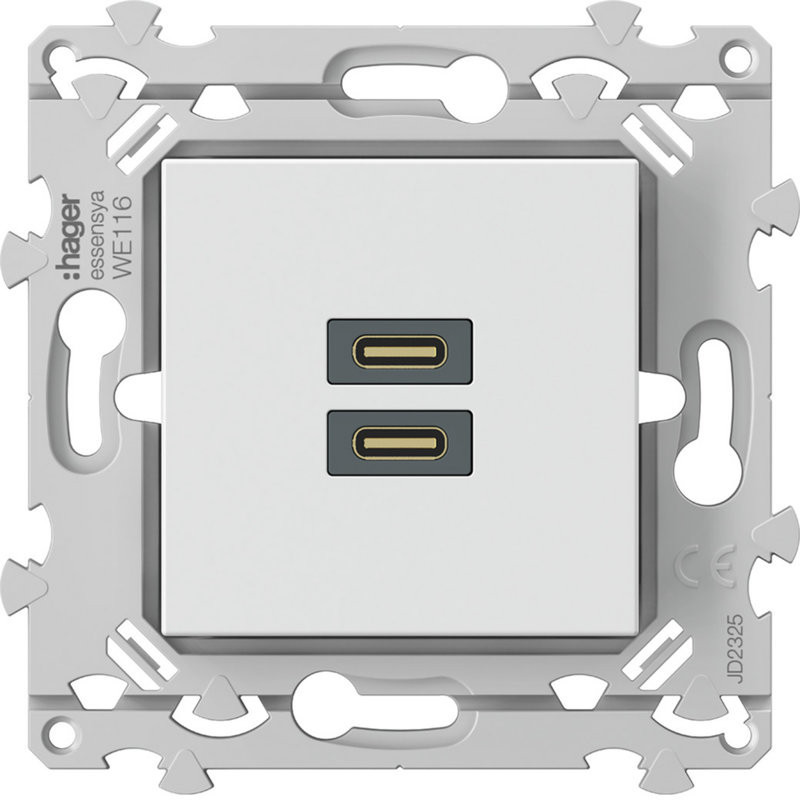 Le chargeur USB C+C WE116 fait partie de la gamme Essensya. Permet de brancher deux produits USB de type C sur le même appareillage mural de puissance 20w chacun.