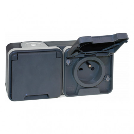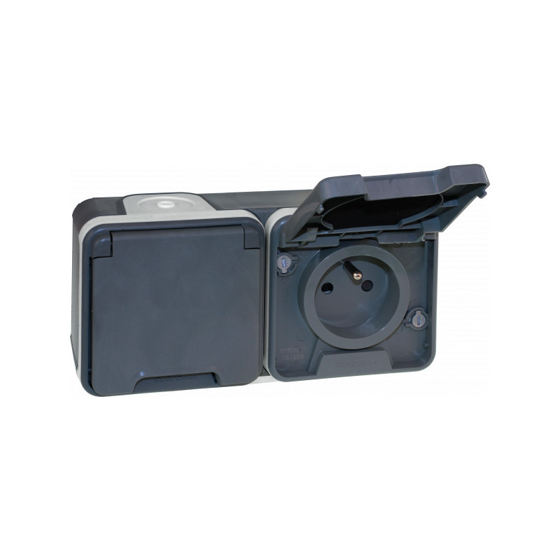La prise Eurohm 60841 est une double prise en saillie certifiée NF/CE. Elle supporte une tension de 250 V, un courant de 16 A, et assure une connexion par bornes automatiques (2 × 2,5 mm²). Dotée d’un indice de protection IP55 (volet fermé) et d’une résistance aux chocs IK08, elle est conçue pour des environnements extérieurs ou humides. Son boîtier antioxydant en polypropylène avec volets en TPE offre une excellente résistance aux UV et aux intempéries. Dimensions : 161 × 80 × 56 mm. Garantie : 2 ans.