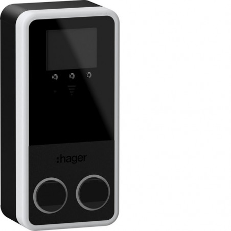 La borne de recharge witty park2 mural IP55 IK10 OCPP d'une puissance maximale de 2x22kW (32A) est équipée de deux prises T2S, d'un lecteur RFID, d'un modem 4G, de deux compteurs MID et d'un écran. Protections intégrées