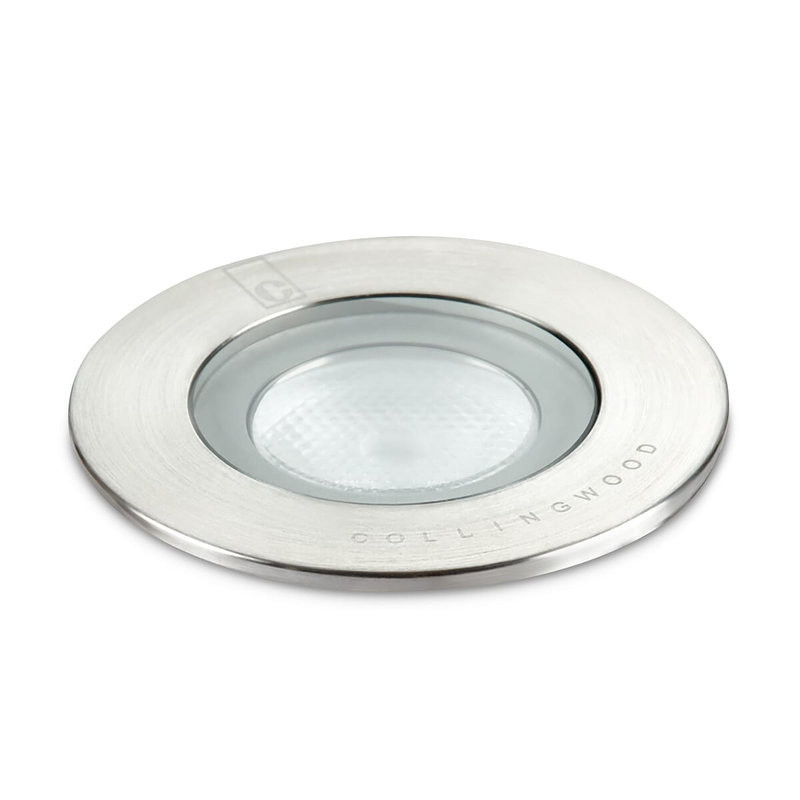 Encastré de sol rond. Diffuseur en verre clair. Inox 316 pour les zones côtières. Tube d'encastrement et 1m de câble H05RN-F fourni. Convertisseur et boîte de raccordement étanche à commander séparément.