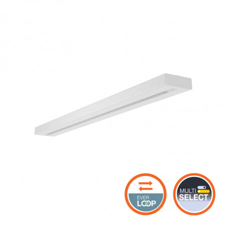 Linear IndiviLED EVERLOOP (source et alim remplaçables). Détection présence, luminosité, gradable. Eclairage direct, 120lm/W, 3000K, IRC90, angle 90°, UGR19, 70000h L80, Classe I. Test fil incan 850°C. 1199x120x40mm. ENEC. Garantie 5 ans