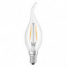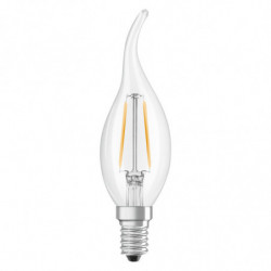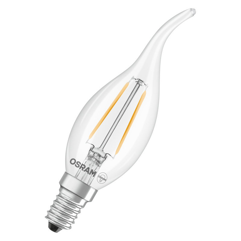Lampes LED, forme classique de mini-bougie avec pointe incurvée. Caractéristiques du produit: Lampes LED professionnelles pour tension secteur. Non gradable. Ouverture du faisceau : jusqu'à 300°. Lampe en verre. Bonne qualité de la lumière ; indice de rendu des couleurs Ra: ≥ 80; chromaticité constante. Avantages du produit: Lampes avec technologie de « filament » LED innovante. Consommation d'énergie inférieure à celle des lampes à incandescence ou halogènes. Pas d'émission d'UV ni d'IR dans le faisceau lumineux. Allumage instantané. Peut remplacer facilement les lampes standard. Puissance thermique plus faible (par rapport au produit de référence standard). Zones d'application: Idéal pour les installations décoratives. Applications domestiques. Éclairage général. Utilisation en extérieur uniquement dans des luminaires d'extérieur appropriés. Conseils de sécurité: Ne touchez pas la lampe si elle est cassée.. Ne doit pas être utilisé si l'ampoule extérieure est défectueuse..