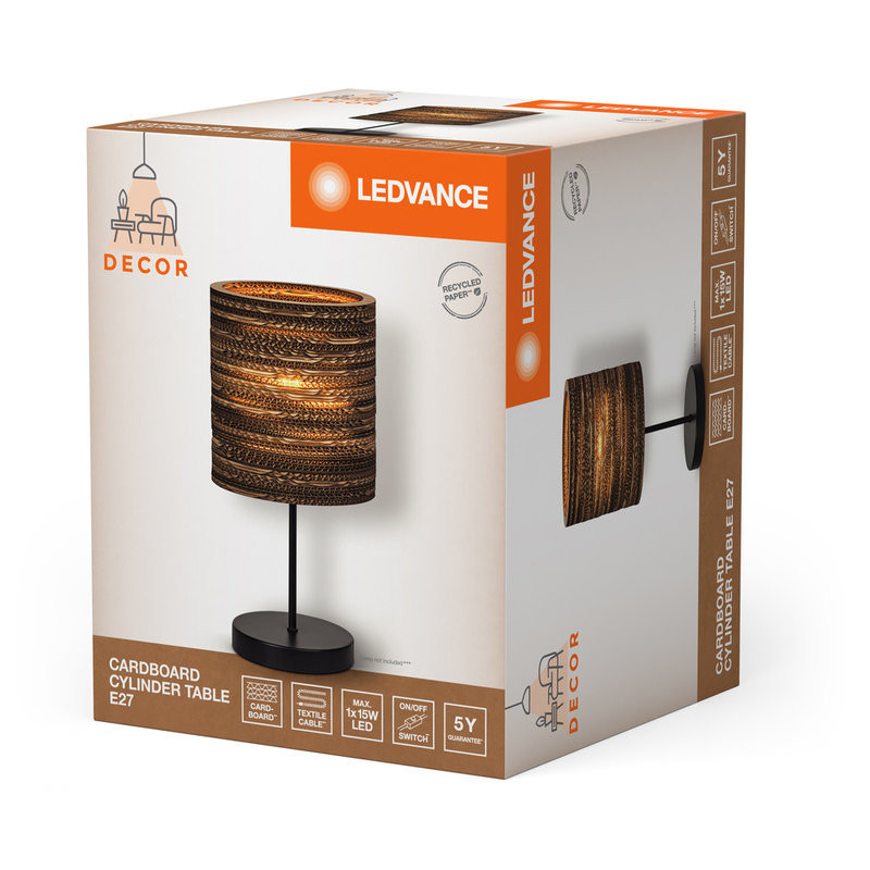 Luminaire décoratif de classe II, 220-240V. Structure en acier noir, habillage rond en carton robuste. Pour lampe LED à culot E27 de puissance maximale 15W. Raccordement par câble de type C 1,5m. Dimensions : ø 200x 385 mm. Garantie 5 ans.