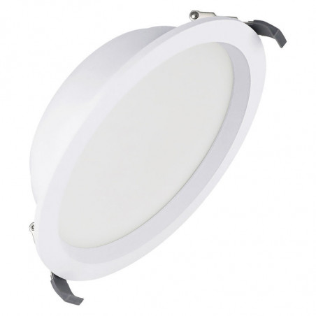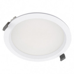 Classe II. Corps en fonte d'alu blanc. Optique opal 100°. Jusqu'à 120lm/W et 70 000h L80. Choix puissance et température de couleur. Alim externe, bornier auto, repiquage. Filin inclus. Découpe ø200mm. Dimension : ø215x59mm. Garantie 5 ans.