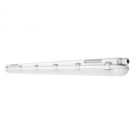 Classe I, corps gris et diffuseur clair (120°) en PC. Alimentation et source LED remplaçables. Jusqu'à 160lm/W, 100 000h L80, SDCM<4, IK08. Choix du flux lumineux sur plusieurs niveaux. CEE. Temp. : -25…+40°C. 1200x82x68mm. Garantie 5 ans.