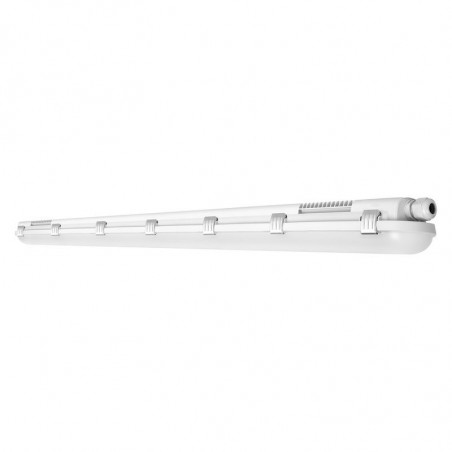 Classe I, corps gris et diffuseur 120° en PC. Alim et source LED remplaçables. 160lm/W, 100 kh L80, IK08. Batterie LiFePO3 3h avec auto test intégrée. Flux lumineux sur plusieurs niveaux. CEE. Temp: -25…+40°C. 1500x82x68mm. Garantie 5 ans.
