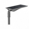 Panneau monocrystallin. Montage top/latéral sur mâts de ø 60mm. Détecteur PIR de présence et de luminosité paramétrable (télécommande en option). 180lm/W, 64000h L80, 35°x145°. Temp : -15…+50°C. Dimensions : 703x301x250mm. Garantie 5 ans.