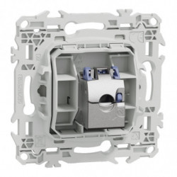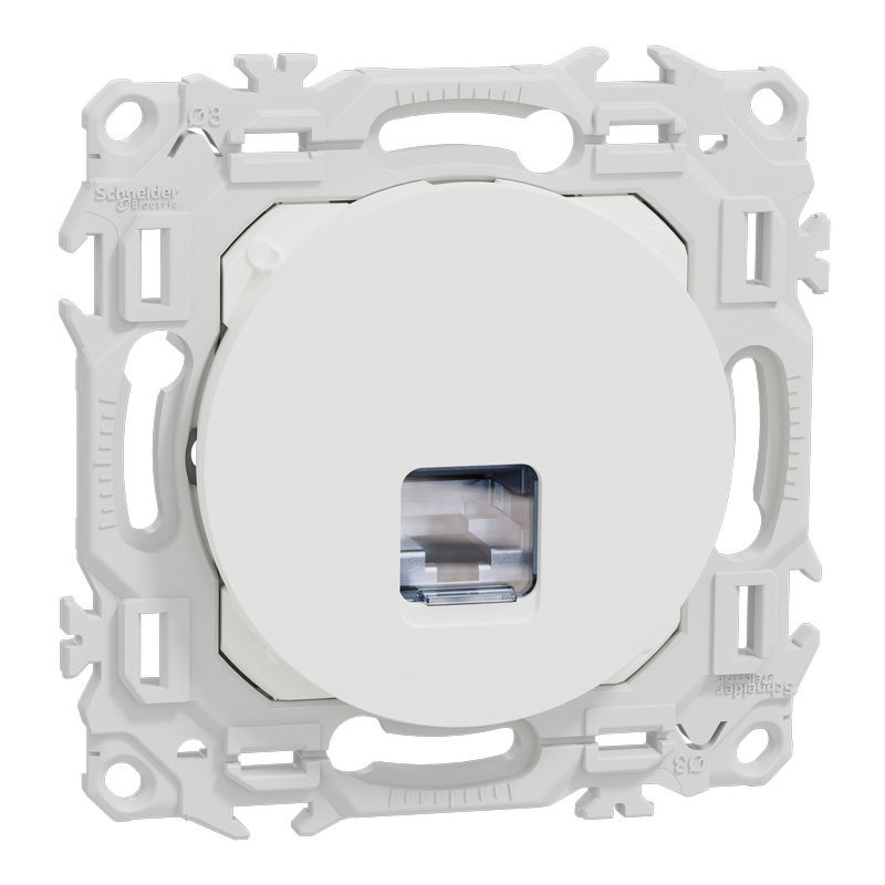 Odace - prise de communication simple - connecteur S-One RJ45 Cat6 STP blindé - grade 2 TV min à grade 3 TV - téléphone + informatique + TV TNT + TV SAT - compatible Gigabit et PoE+ - cache peinture - blanc RAL 9003 mat - IK04 IP20