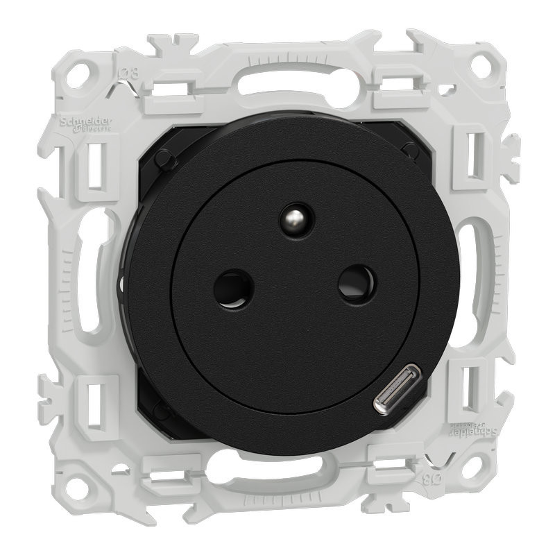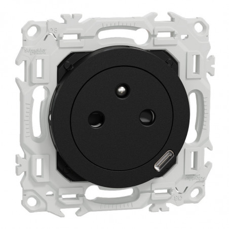 Odace - prise de courant 2P+T affleurante avec USB-C 18W PD3.1 - montage griffes possible - 3x2 bornes auto - 1x1,5 à 2x2,5 mm² rigide ou souple - 16A 250VCA 50Hz - cache peinture - noir RAL 9005 mat - IK04 IP21D - certifié NF