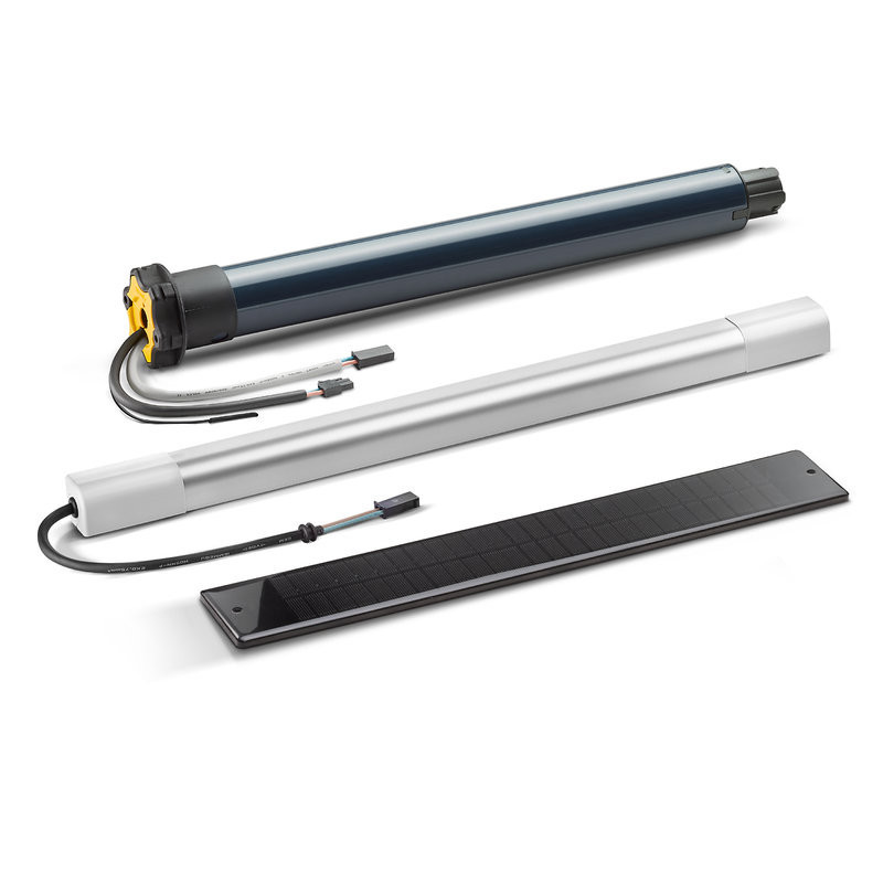 Kit de motorisation solaire RS100 Solar io comprenant Moteur nu, Panneau solaire à trous, Batterie coquée et Service pour volets roulants. Solution brushless ultra-silencieuse en diamètre 50 avec écosystème de services. A l'unité.