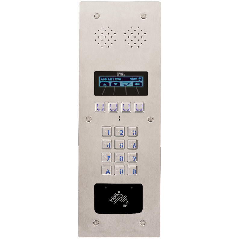 Platine de rue inox interphonie vidéo à défilement des noms 2VOICE caméra discrète avec écran 2 lignes et emplacement pour un lecteur T25. La caméra avec LED infraouge est intégrée dans un trou se confondant avec le haut-parleur.